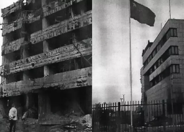 几枚导弹让大使馆主楼轰然倒塌,大使馆内20多名工作人员受伤,三名记者不幸阵亡!