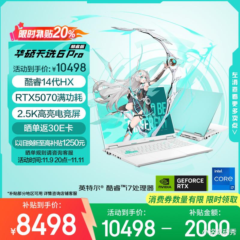 目前双十一促销活动已经慢慢的接近尾声了,还没蹲到心仪游戏本的朋友注意了!华硕天选 6 Pro 系列放大招,三款热门机型同步开启降价福利,叠加双十一立减、领券和国家补贴,到手价会让你眼前一亮,错过再等一年的超值机会,游戏党、创意工作者赶紧码住!