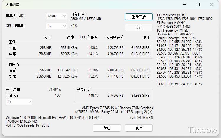 对于日常办公来说,7-ZIP基准测试代表了整机的生产力性能,成绩与CPU和内存性能强相关。