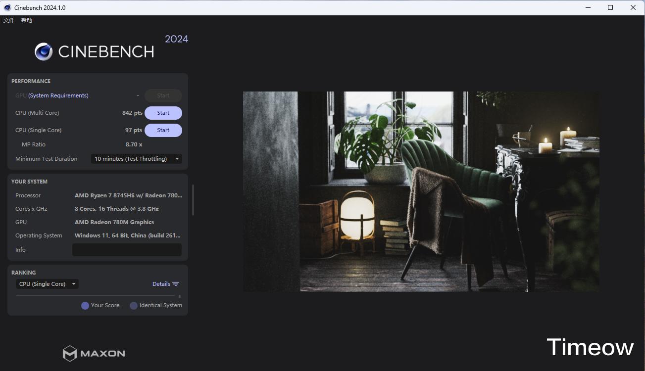 Cinebench 2024采用了全新的机制,海尔云悦mini R多核跑分842,单核跑分97,处理器性能释放比桌面级的经典处理器5800X还要强。
