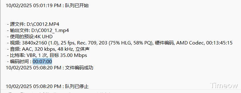 接着来看一下视频转码,使用Adobe Media Encoder 2025对一个用索尼A7R2拍摄的、13分多钟、H264格式、100Mbps的4K视频转码,目标格式为H265(HEVC)、35Mbps、4K(预设4K UHD),这个测试主要考验了处理器或核显/显卡的编码性能。