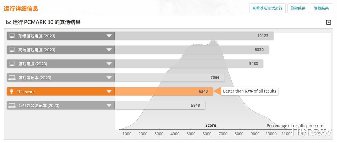 在PCMARK 10的在线结果评比中,对比其他参与测试的高性能电脑,这台迷你主机的得分好过67%的机型,与之相似的高端商务办公笔记本和游戏笔记本得分与它相似。