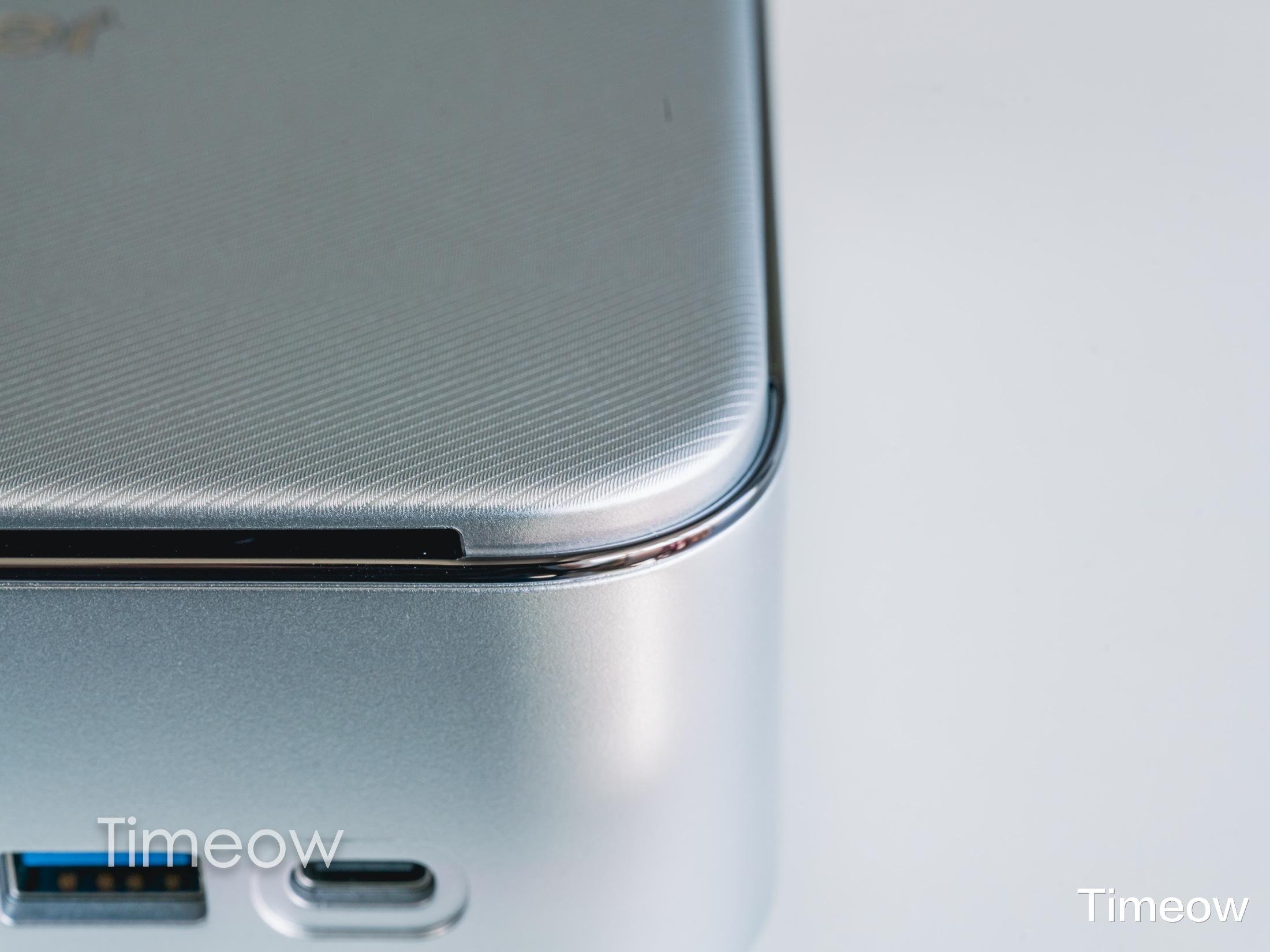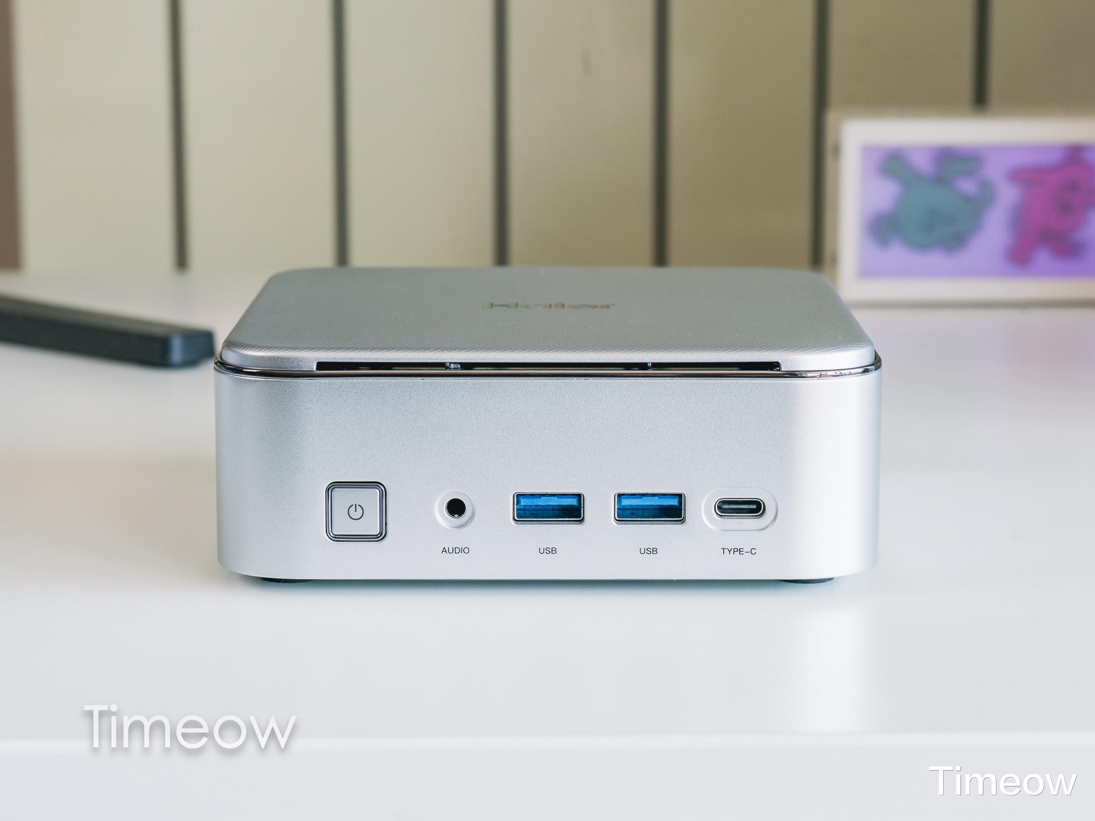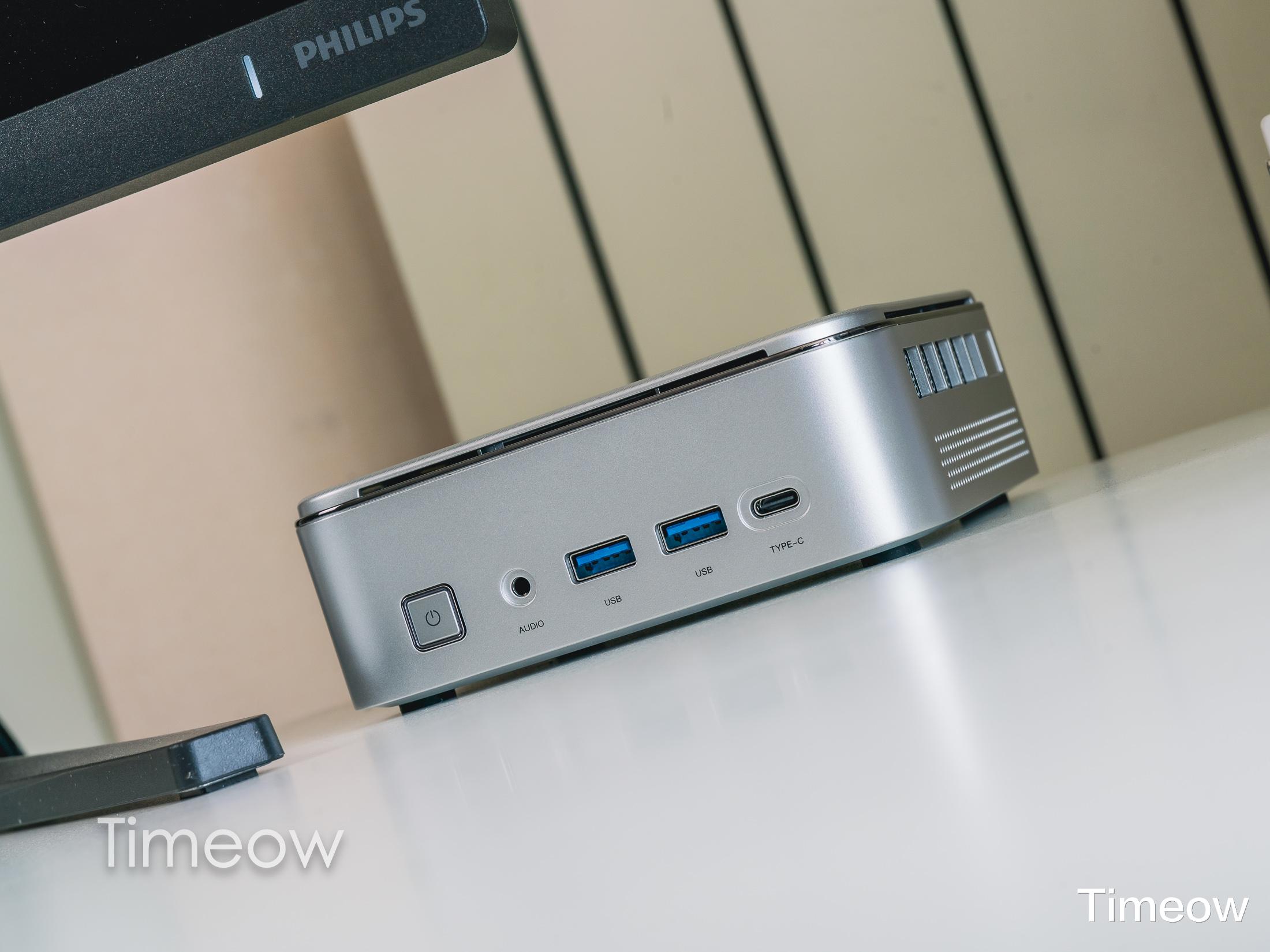 正前方,有两个USB 3接口(5Gbps)和一个支持40Gbps的USB4接口(Type-C),以及电源键和3.5mm音频接口,方便我们连接经常插拔的耳机、移动硬盘和U盘等设备。