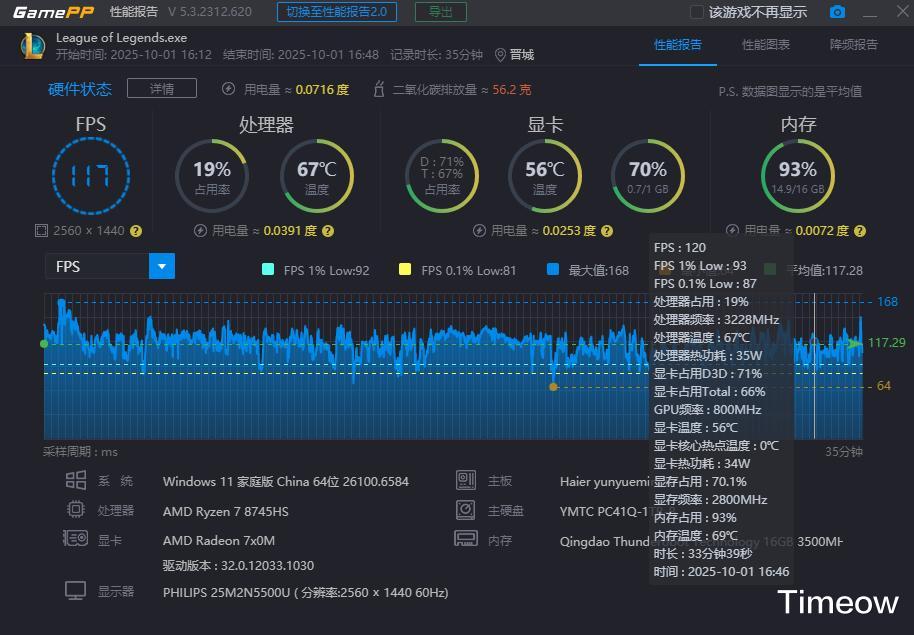 在默认2K分辨率+中画质下,海尔云悦mini R可以稳定运行在100多帧以上,达成平均117帧的性能表现,low帧也有90以上,体验还是非常丝滑的。