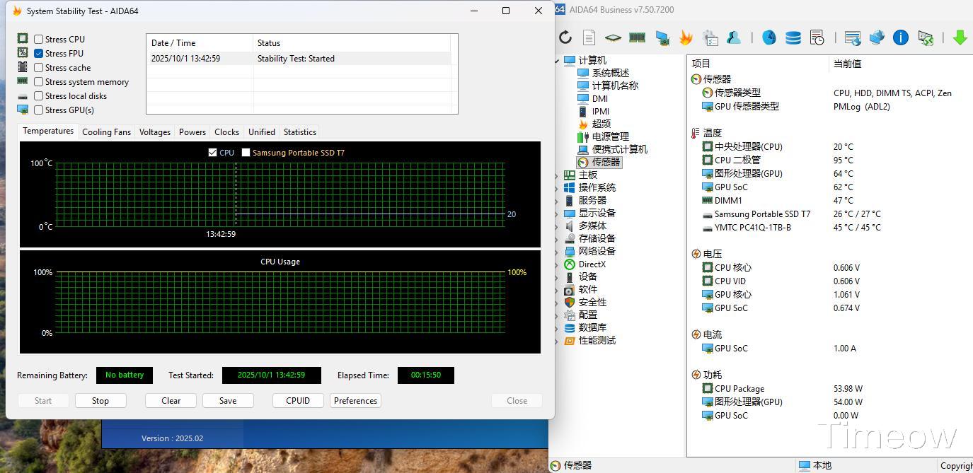 在BIOS中开启Performance Mode后,在AIDA64稳定性测试中,运行FPU压力测试,15分钟的烤机测试中,CPU功耗可以稳定在54瓦。虽然处理器的温度贴着95摄氏度,但整体没有过哪怕一次降频,供电和性能释放都相当稳定!