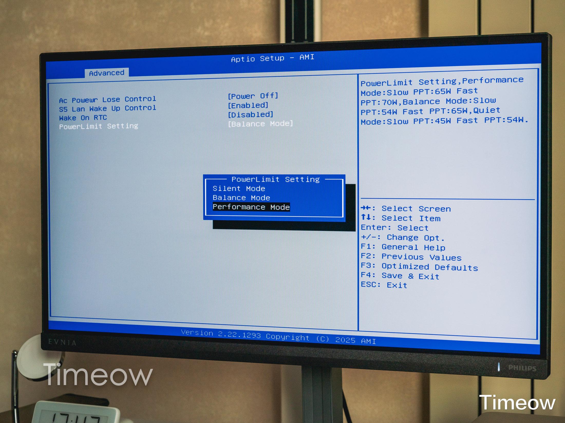 接下来,再试试开启BIOS里的性能模式(Performance Mode,开机时狂按DEL键,找到PowerLimit Setting):