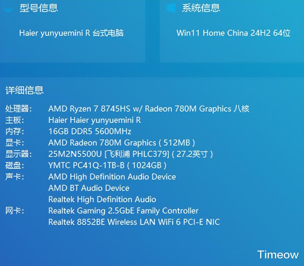基本配置介绍配置信息如上,海尔云悦mini R用上了AMD Ryzen R7-8745HS处理器,相比8845HS,它去掉了NPU(神经网络处理单元),却也让整机价格更划算了。如果日常没有使用侧端AI应用需求的话,8745HS机型绝对是性价比之选。