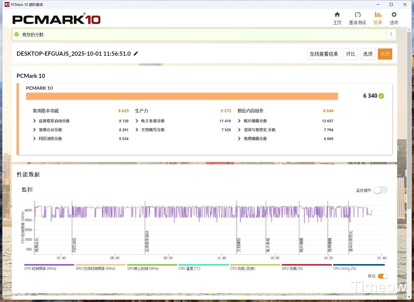 PCMARK 10通过office办公、图片处理、视频会议等项目,来评估整机的生产力性能,包对了解整机的持续性能释放有较高的参考价值,海尔云悦mini R综合得分为6340分。