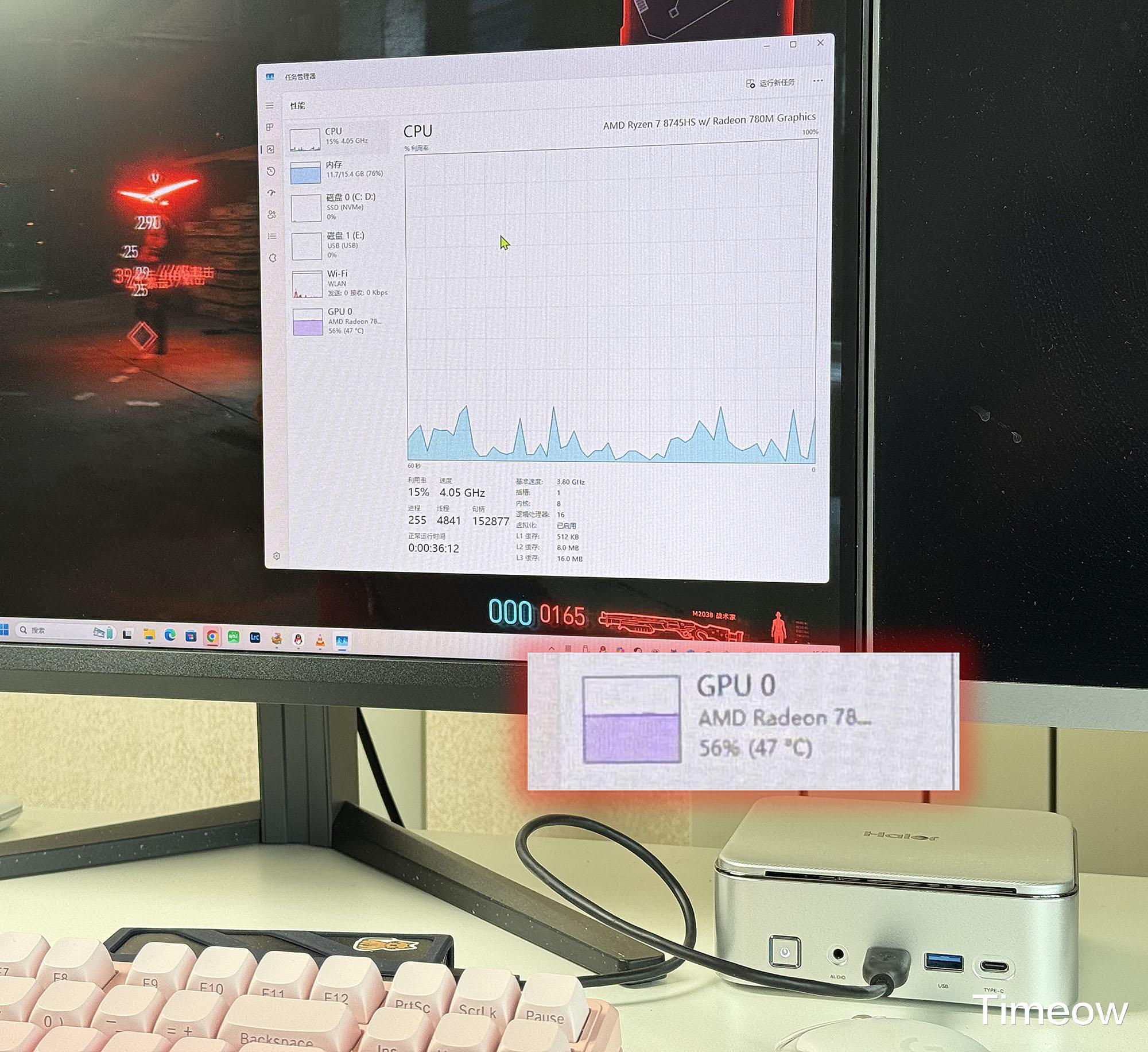 不过,需要注意的是,海尔云悦mini R搭载的8745H处理器的780M核显,严重依赖于内存性能,由于我这次测试用的机型为16GB单通道内存,所以在游戏体验上会有所折扣。如果你对GPU/游戏性能比较看重的话,我推荐你买32GB款(双通道内存),GPU的游戏性能释放会更强。