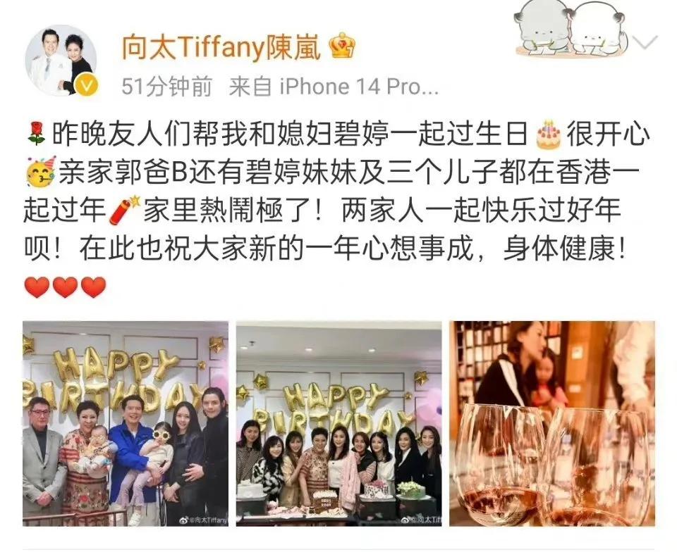 向太晒全家为郭碧婷庆生照破婚变传闻! 之前向佐和郭碧婷被爆婚变,郭碧婷又在网络平台上取关向佐,这种操作不得不让人怀疑! 而就在网友们疑惑不解的时候,向太就晒出了全家给郭碧婷庆生的和谐画面,这也算谣言不攻自破了! 向太和郭碧婷的生日,两人只差一天,向太在各个网络平台上都发了合照或视频,而向太唯一点赞的评论是“说离婚的真得是谣言,好好的在一起”! 果然,还是得向太出手!郭碧婷向佐离婚传言不攻自破,这个家没有向太可咋办啊[左捂脸]? 话说看看人家向太这公关都不需要花钱,发个全家福就行!向太还透露两家人都在香港一起过年,家里热闹极了! 网友们纷纷表示,真的是只要向太在,这个家就不会散!向太是维系向郭婚姻的坚实纽带! 不得不说向太确实厉害,不管真相如何,这个家是散不了的!