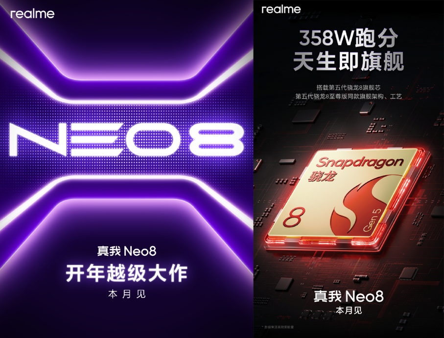 日前,@真我手机 连续发布了两张预热海报,并配文称,“越级性能,天生旗舰!#真我Neo8#搭载第五代骁龙8旗舰芯,第五代骁龙8至尊版同款旗舰架构、工艺,高达358W跑分,为极致性能体验而生。开年越级大作,本月见!”“开年越级大作#真我Neo8#,本月见!新一代潮玩电竞旗舰,为你而来。”