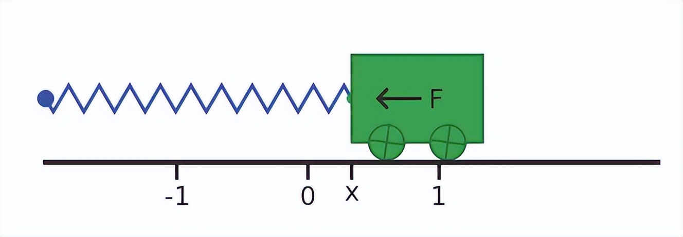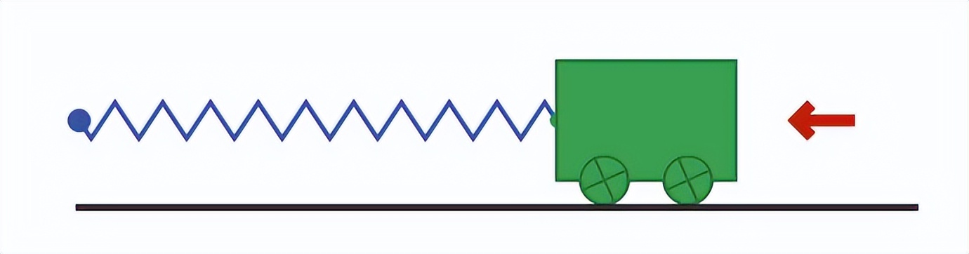 弹簧的力使手推车加速。当手推车到达中点时,弹簧不再处于张力状态,所以它不再拉手推车。然而,手推车现在获得了动量。它继续移动,压缩弹簧,减慢手推车的速度。最终,手推车停下来,但现在弹簧被压缩,导致手推车开始朝相反方向加速。这个运动是循环的,如下所示: