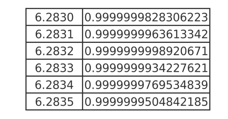 一系列尝试得出,这个值在6.2830和6.2835之间的某个地方。下面这个表计算函数在这两个极限之间的各种值