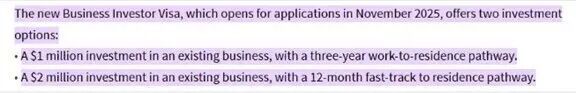10月20日,新西兰移民局官宣,Business Investor Work Visa(商业投资工作签证)的申请将于2025年11月24日起正式开始。