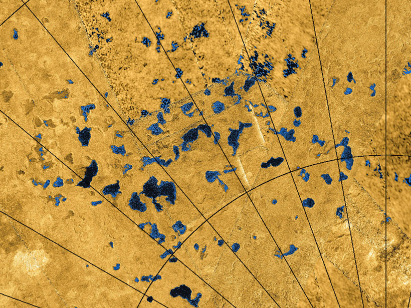 泰坦北极附近湖区的雷达图。这些来自宇航局卡西尼号宇宙飞船的数据被错误地着色,以突出显示表面上有液态碳氢化合物的区域(蓝黑色)和干燥的区域(棕褐色)并覆盖有地理网格(黑线)。