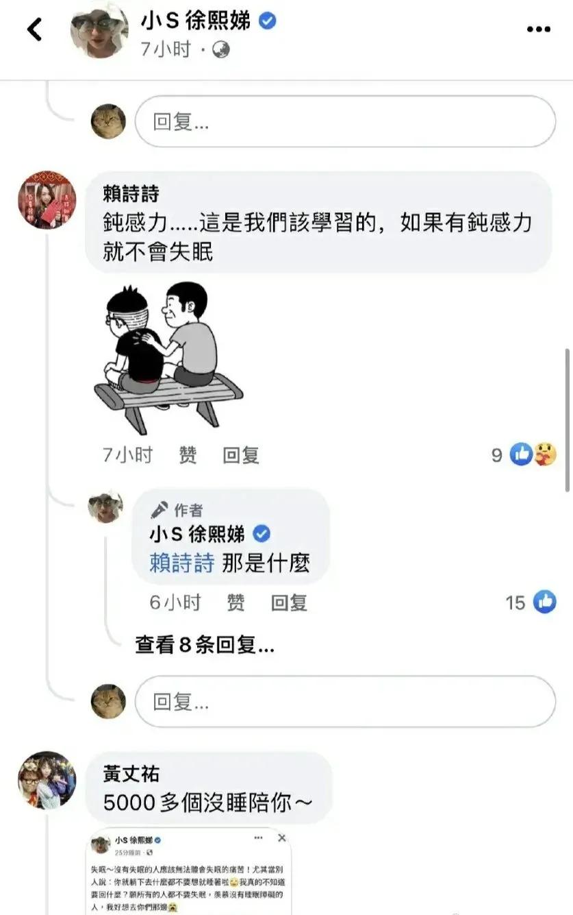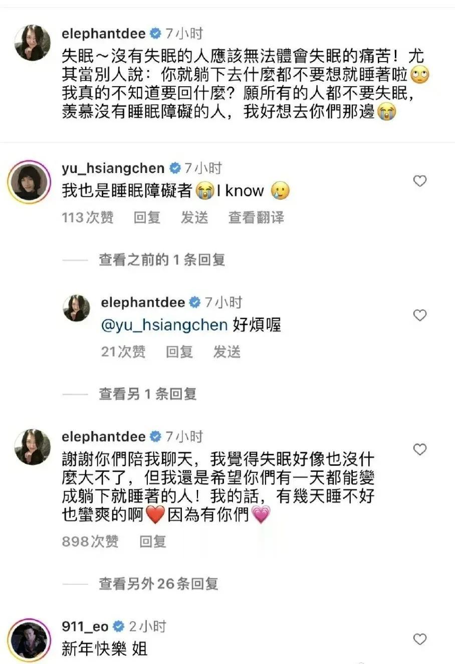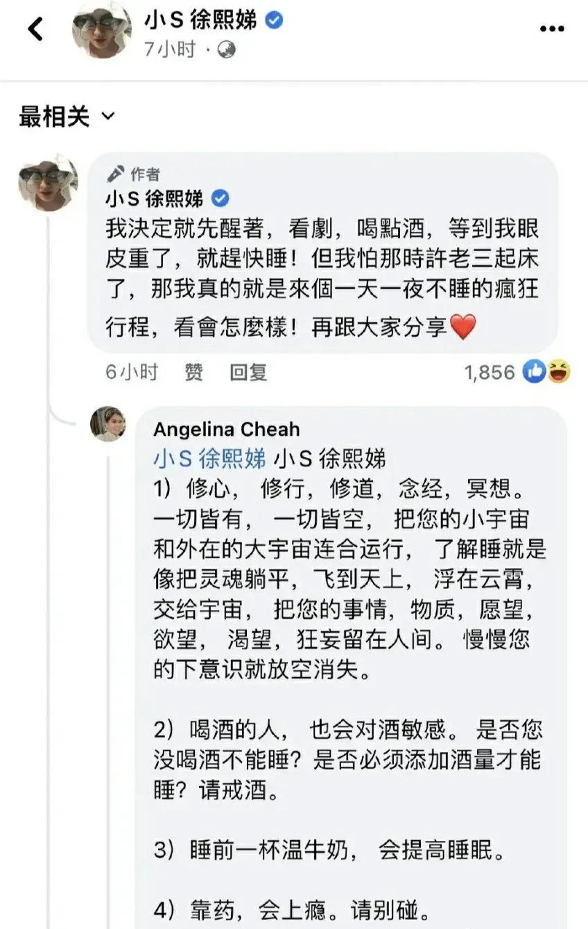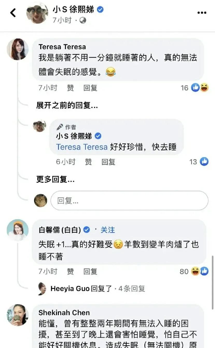 小S深夜发文面容憔悴情绪低落! 小S深夜发文表示自己失眠太羡慕没有睡眠障碍的人! 受失眠的困扰她决定先看看剧再喝点酒,就这样熬着,什么时候困什么时候睡! 小S还说自己有一个疯狂的计划,让自己一天一夜不睡觉看看会是怎么样的状态,还要分享给大家! 小S还和网友积极互动,但细心的网友推测小S应该是和老公分床睡的,夫妻二人名存实亡的传闻应该是真的!