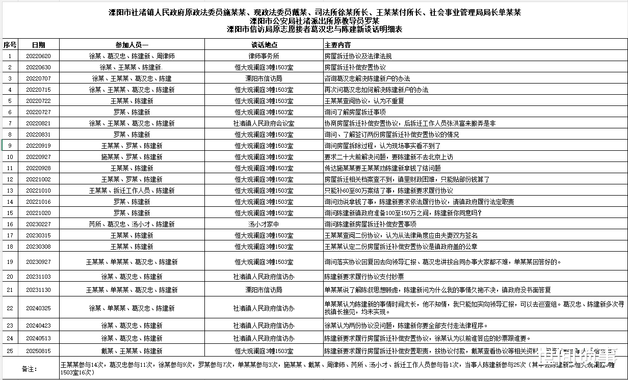 多年来,陈建新持续向各级政府部门反映情况,但相关问题尚未得到实质性解决,双方对事实的认定仍存在显著分歧。现有材料显示,常州中院法官的再审释明谈话已明确,334万元仅为陈建新妻子姜彩芬名下的协议款项,并未涵盖全部补偿金额;此外,曾参与多方协调工作的溧阳市信访局原志愿接待人员葛汉忠证实,镇政府在协调过程中曾承认尚未全额支付陈建新主张的346万元补偿款。更为关键的是,2022年6月至2025年8月期间,镇政府工作人员与陈建新进行的25次官方谈话记录,均间接印证了补偿款尚未结清的客观现状。上述司法释明、证人证言及行政谈话记录,共同构成了完整的证据链,指向拖欠补偿款这一核心事实。