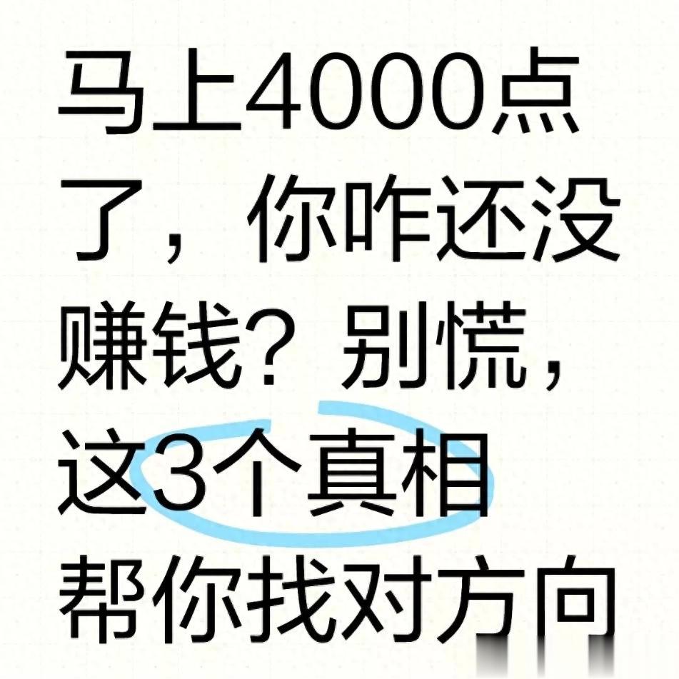 现在大家觉得“4000点不激动”,本质是没尝到赚钱的甜头。要是像全面牛市那样,手里的股票天天涨,谁还会淡定?可现在更多人的状态是“指数涨了,我的票没动”,甚至“指数涨了,我的票还在跌”,这种情况下,别说激动,能不焦虑就不错了。