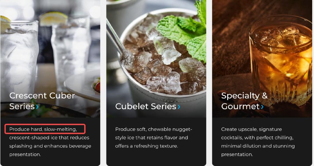 制冰机品牌星崎官方网站也把“生产的冰块坚硬且融化更慢”单独作为月牙冰制冰机的独特核心卖点。