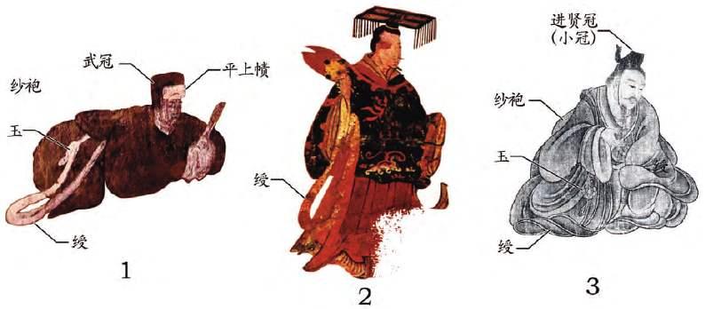 舆服志》,按照不同级别,官员绶带的颜色与长度是不同的,所以处理公务时,大家常常只认绶不认人。 另外,绶带不单单装饰腰带一侧,更像是腰带的装饰品,有前绶、侧绶、后绶,在侧绶处悬挂成组编缀的玉器,称圭。具体形制如下 (1)乘舆(即天子)黄赤绶,四采: 黄、赤、縹、紺,纯黄圭,长二丈九尺九寸, (2)诸侯王赤绶,四采,赤、黄、縹、紺,纯赤圭,长二丈一尺。 (3)诸国贵人、相国皆绿绶,三采: 绿、紫、紺,纯绿圭,长二丈一尺。 (4)公、侯、将军紫绶,二采: 紫、白,纯紫圭,长丈七尺。 (5)九卿、中二千石、二千石青绶,三采: 青、白、红,纯青圭,长丈七尺。