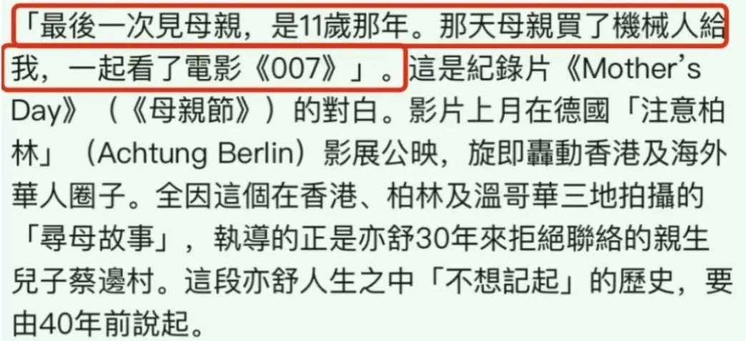 蔡边村11岁那年,亦舒带他看了一场电影后,便从儿子的世界消失。