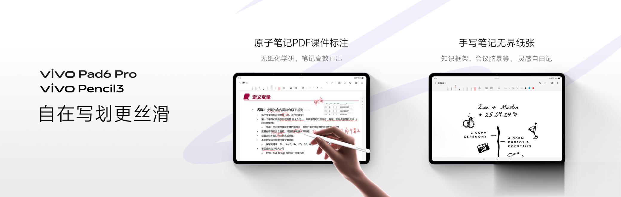 整体配色上,vivo Pad6 Pro拥有松弛蓝、灵感紫、自在灰三款配色。同时,还带来vivo Pencil3和智能触控键盘6 Pro两款智能配件,构建完整的体验生态。