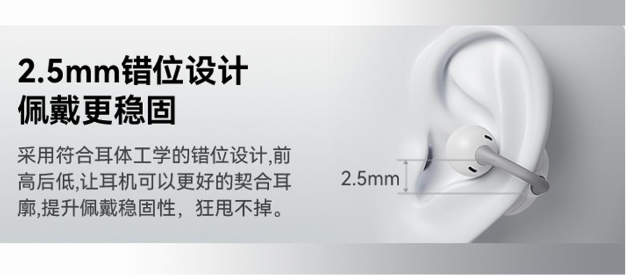 佩戴体验格外出色,单耳仅 4.5g,佩戴轻盈无压力,长时间使用也不会压迫耳部。耳机采用2.5mm 错位设计,戴着呈现一个前高后低的结构,更贴合耳型,稳定性更好;搭配耳机特有的的12°弧面耳托分散耳部压力,佩戴牢固又舒适,不同耳型也能完美适配。