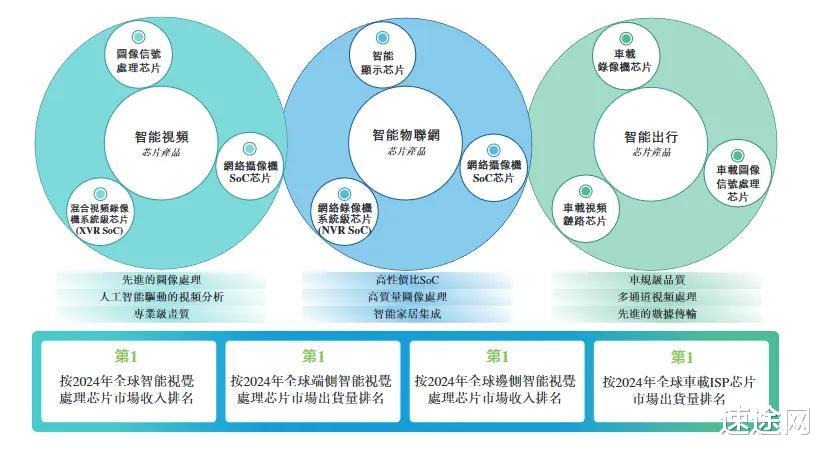 三大产品线构筑护城河:端侧芯片出货量全球第一,车载ISP市占率领先富瀚微的核心竞争力源于“智能视频+物联网+出行”三大产品线。据弗若斯特沙利文数据,2024年公司端侧智能视觉芯片出货量全球第一,车载ISP芯片出货量同样登顶,安防领域的网络摄像机SoC芯片市占率达21.3%。