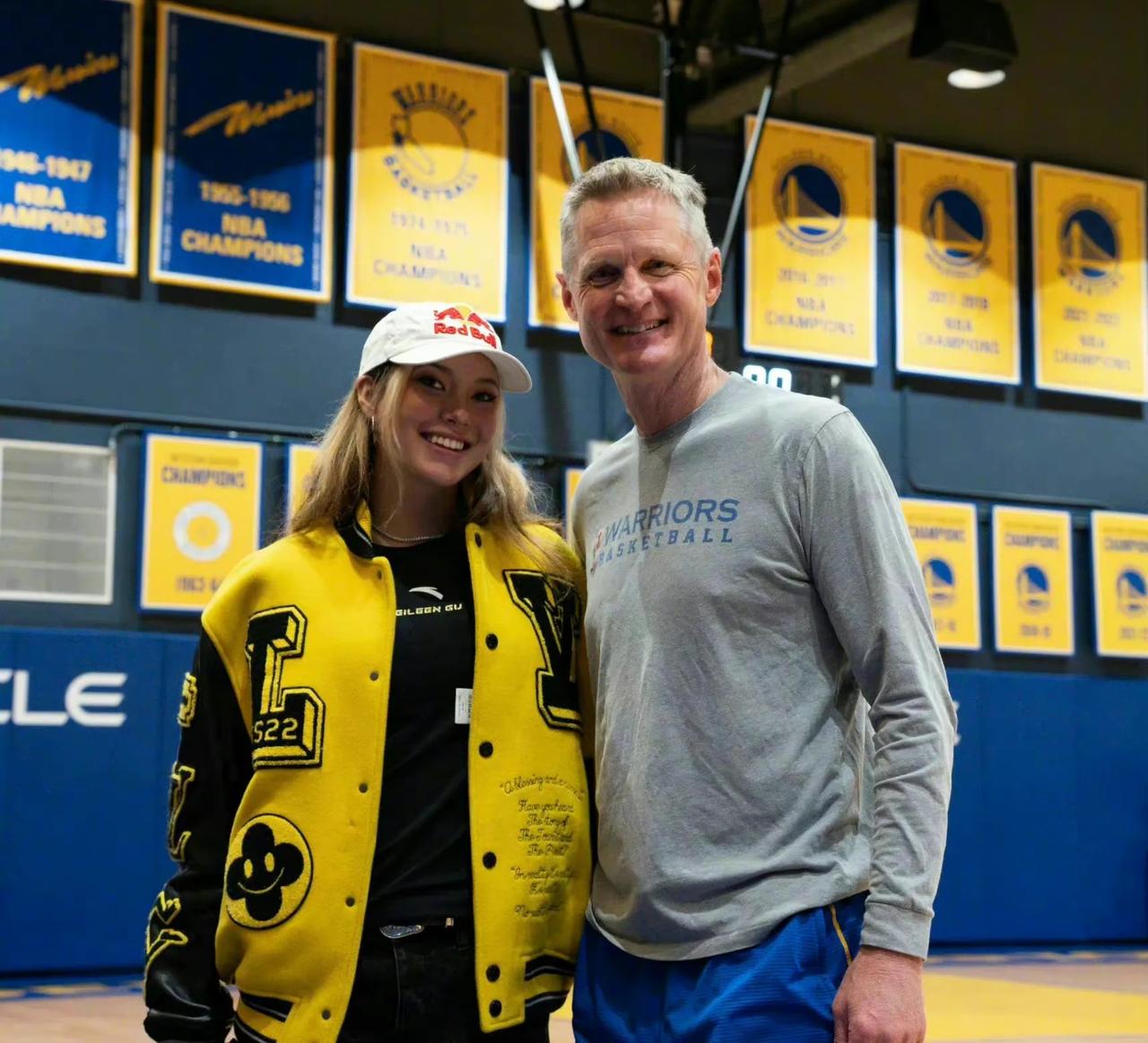 谷爱凌现身勇士训练馆与勇士主帅科尔合影! 近日,谷爱凌现身勇士训练馆,与勇士主帅科尔以及其他偶像合影! 还现场观看了湖勇大战,在现场大屏介绍了这位奥运冠军,谷爱凌热情的向大家展示身穿的勇士11号球衣! 话说谷爱凌这身高真是可以,和NBA球星合影居然没有小矮人的感觉! 喜欢她的头发好漂亮,笑容也很真实有亲和力,这么优秀的女孩子有才还有貌,真羡慕她的妈妈[尬笑]