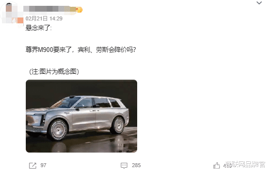 图源:微博外观设计上,尊界M900延续了品牌家族式风格,但又加入了SUV的硬朗气场。不过,看了爆料的渲染图的网友直言,这款车的部分设计元素,和劳斯莱斯库里南有些相似,难免让人产生“撞脸”的联想。