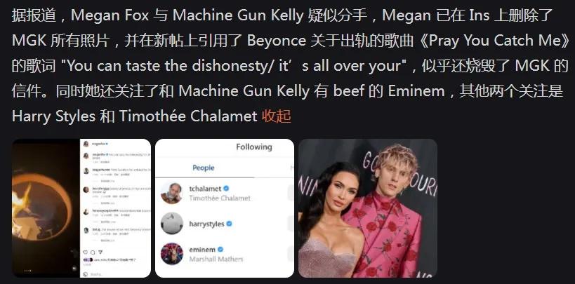 梅根福克斯和枪爷疑似分手! 据有关媒体透露,梅根福克斯Megan Fox 和枪爷 MGK疑似已经分手! 在这之前两人一直以来都是恩爱有加,每次亮相都是成双成对,情意浓到相互喝对方的血! 而现在虽然未正式取消订婚,据知情人表示梅根Megan 已经摘掉了订婚戒指,据传这枚戒指里面设计是荆棘,如果要摘下戒指梅根会遭受刺痛! 知情人还表示虽然他们过去曾有过争吵,但这次情况似乎相当严重!