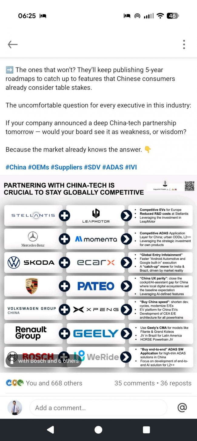在领英上发布的深度观察,直言不讳地指出,西方车企已无法单独追上中国汽车技术的代差,与中国科技企业深度合作已不再是锦上添花的选项,而是其维持全球竞争力的核心生存策略。