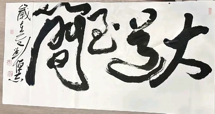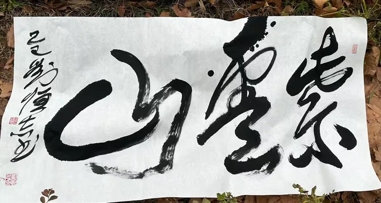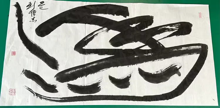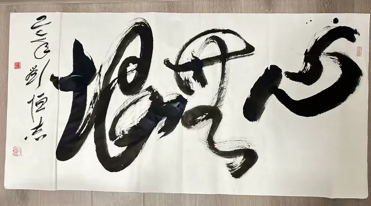 刘恒志的章法功力——“泰”繁“山”简,疏密相济,在强烈对比中构筑视觉和谐;题款线条的纤细与主字墨色的沉厚形成呼应,无一处刻意,无一笔凝滞,整体布局气脉流转、浑然一体,将书法的空间美学诠释得淋漓尽致。