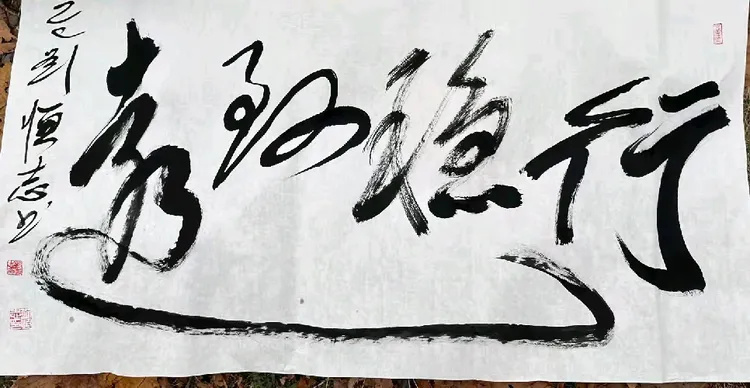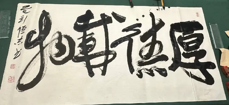 刘恒志先生笔下,笔法苍劲如松,行笔挥洒自如间藏千钧力道。线条粗细变幻,提按转折皆见功底,草书的豪放与行书的流畅浑然相融。“厚德载物”的胸襟、“家和万事兴”的温情,在笔墨张弛中迸发磅礴精神张力,一字一画,皆是心性与修为的凝练。