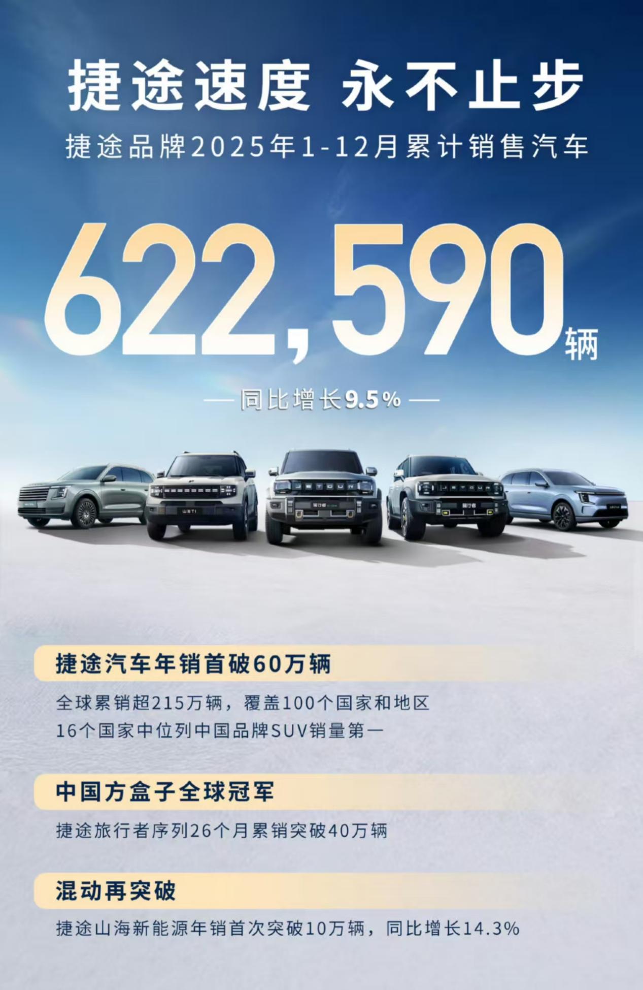 捷途2025年销量622,590辆,7年累销突破200万。在家用SUV的高性价比取得了不俗的销量之上,捷途品牌根据市场热情,推出的旅行者序列成为“中国方盒子全球冠军”,而新能源的山海,也实现了年销破10万。