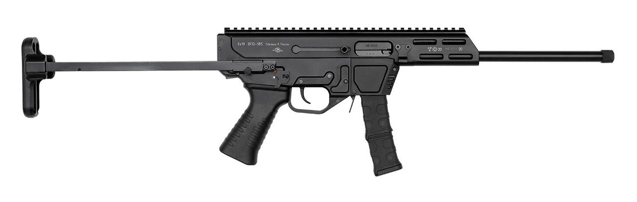 俄罗斯Molot工厂推出VPO-185半自动卡宾枪 这是一款由俄罗斯Molot工厂推出的面向俄罗斯民用市场的半自动卡宾枪,口径为9mm,发射9mm巴拉贝鲁姆手枪弹,外观为卡宾枪样式,采用通常手枪/冲锋枪采用的自由枪机式自动原理。拉机柄可设置在机匣左右侧,方便左右利手射手使用。机匣顶部设有皮卡汀尼导轨,以加装光学瞄准镜。聚合物握把上方设有保险,操作方便。弹匣卡笋为片状,设在扳机护圈前方。枪托为伸缩式,但与一般伸缩式枪托有多档位置可调不同,该枪托要么完全缩回,要么完全展开,即需要抵肩射击时,要将枪托完全展开。枪托缩进后全枪长585mm,枪托展开后全枪长820mm。枪管长305mm,枪管口部制有螺纹,可加装消焰器、消声器等膛口装置,不需要加装膛口装置时,可加装枪口帽以保护螺纹。聚合物弹匣容弹量10发,空枪质量2.6kg。