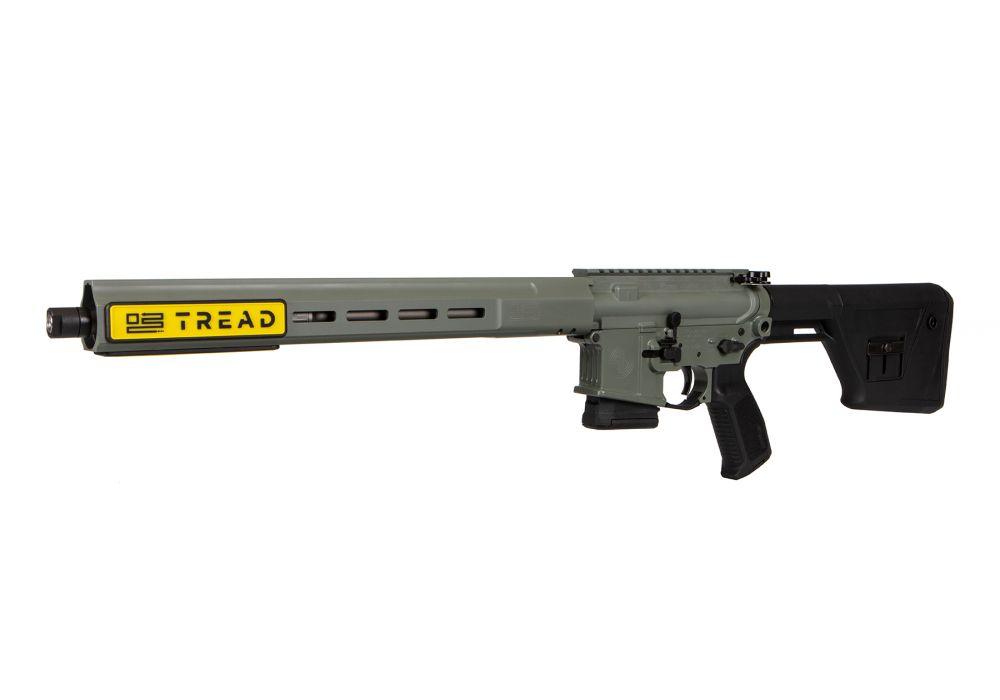 这是西格M400 TREAD系列,名称很特别,英文为TREAD PREDATOR,直译过来就是“行走的掠食者”。该枪为双色涂装,铝合金、机匣为绿色,枪托、弹匣、握把等外露部件为黑色。绿色的铝合金护手把枪管完全包裹其中,只露出枪口部分。不锈钢枪管口部制有螺纹,可根据需要加装不同功用的枪口装置,不加装枪口装置是,需加装枪口帽以保护螺纹。铝合金护手上贴有“Terad”标志,表示该枪属这个系列。护手上下及正向左右侧均设有M-lok接口,射手可根据需要加装导轨和所需的附件。机匣顶部设有皮卡汀尼导轨。配用的小握把为西格自行生产的聚合物小握把。其配用的枪托为固定式,不可伸缩,枪托上设有一个可调节高度的贴腮板。图中该枪配用10发容弹量聚合物弹匣,当然也可以换装其他弹匣。该枪口径为5.56mm,发射5.56mm北约制式枪弹。枪管长406mm,全枪长902mm,全枪高191mm,全枪宽64mm,空枪质量3.4kg。售价为1099.99美元。