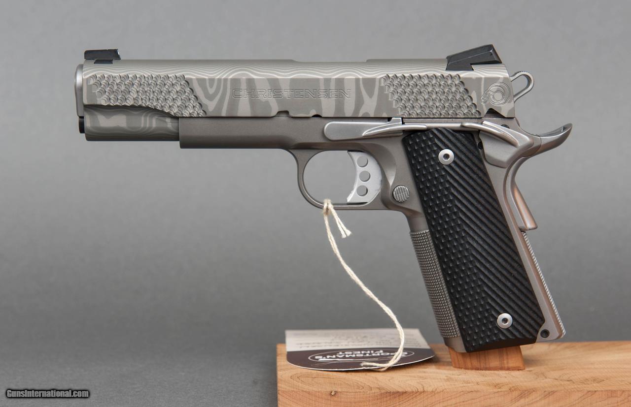 美国克里斯坦森武器 (Christensen Arms) 公司1911G5手枪 这是一款由克里斯坦森公司生产的M1911类型高配置手枪,外观主体为银色,只有握把护板、准星与照门为黑色,全枪制造精良,颇具艺术范儿。其套筒前后方制有鱼鳞状防滑纹,并且还呈现有不同形状的装饰花纹,显得高贵而大气。握把护板制有两种防滑纹,左侧为斜条状防滑纹,右侧为颗粒状防滑纹,握把前后方则制有如大多手枪一样的麻点状防滑纹。采用比赛级不锈钢枪管,套筒和套筒座亦由不锈钢材料制造。套筒左侧中央刻有公司铭文,握把上方刻有公司信息铭文及枪号。这款“全不锈钢”手枪售价为2895美元,另有一款套筒座采用钛金属制造而成的手枪,售价高达4795美元。由此可见这款高配置手枪价格不菲。两款1911G5手枪分别有0.45英寸和9mm两种口径。0.45英寸口径型弹匣容量为7发,9毫米口径型弹匣容量为9发。全枪长216mm,枪管长127mm。不锈钢套筒座型号空枪质量为1.2kg,钛金属套筒型号为1.0kg。