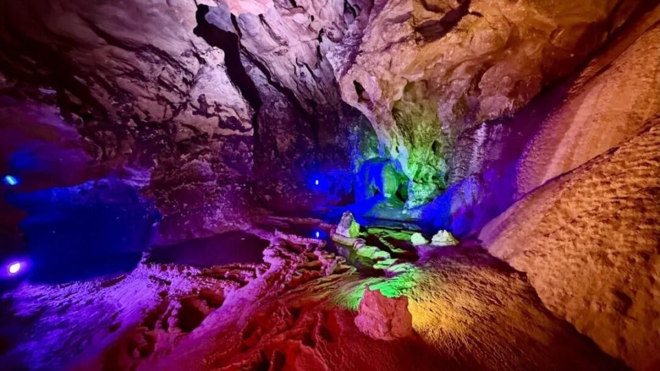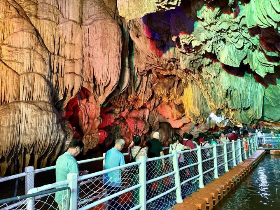 金龙洞地下河内,天然形成的石笋、钟乳石群,在彩灯下幻化成“金龙腾飞”“元阴石”“音乐石壁”“石瀑布”等地质奇观。