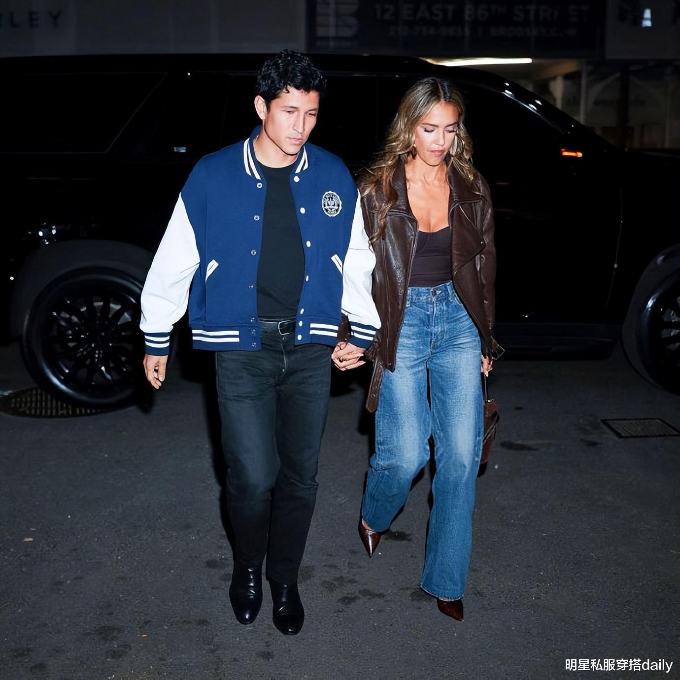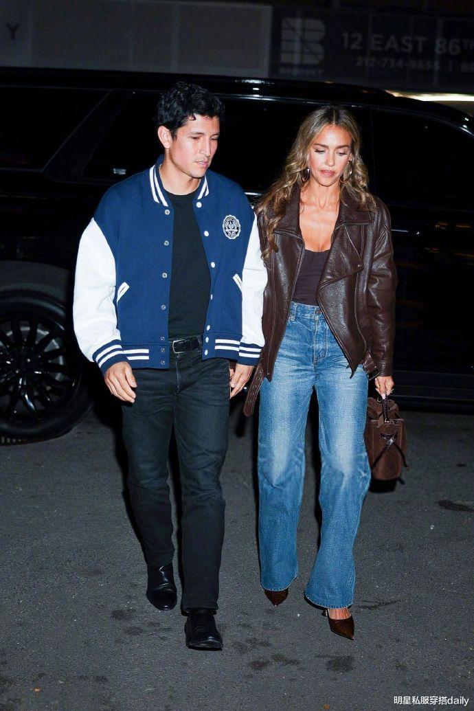 look2:深棕色飞行员夹克+蓝色牛仔裤!另一套约会造型中,杰西卡・阿尔芭用一件超大号外套,演绎出 “男友风” 的慵懒与随性。她选择的深棕色飞行员夹克,宽松的 “oversize” 版型自带松弛感,弱化了身材曲线,却意外凸显出随性洒脱的气质;深棕色自带温暖复古滤镜,无论是秋冬季节还是街头场景,都能轻松融入氛围,尽显低调高级。