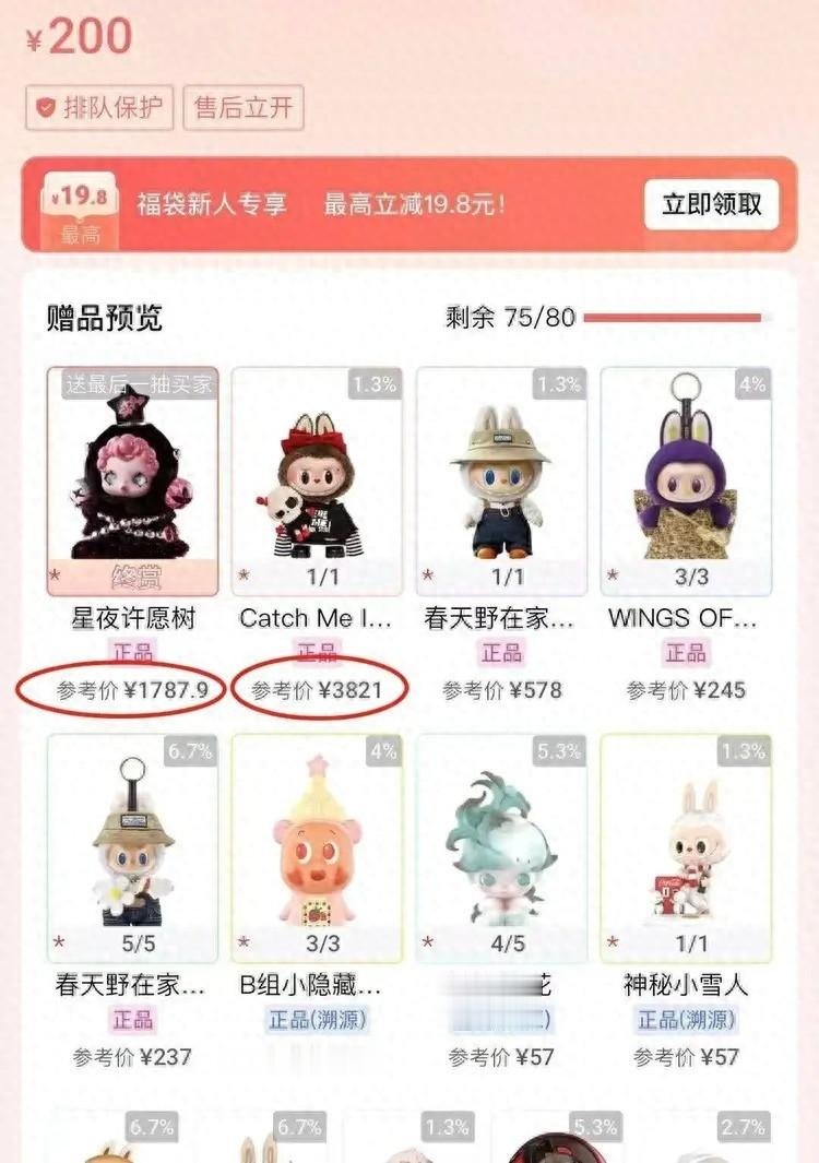 蓝女士介绍,每车福袋最多设100个实物奖品,买家能提前看奖池物品及市场价,完成支付后才可以看到自己抽中了什么。福袋的售价由卖家设置,大多在30元至200元之间,同一车福袋可以包含多种系列的产品,也就是说,几十元的福袋对应的可能是20元的常见款,也可能是上千元的隐藏款。