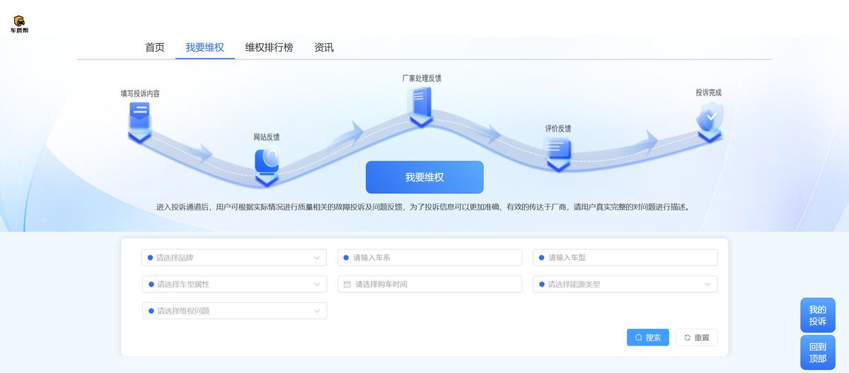 微信小程序:直接搜索 “车质帮”,进入后填写投诉内容(含车辆品牌、车型、购买时间、问题描述、相关证据截图等)