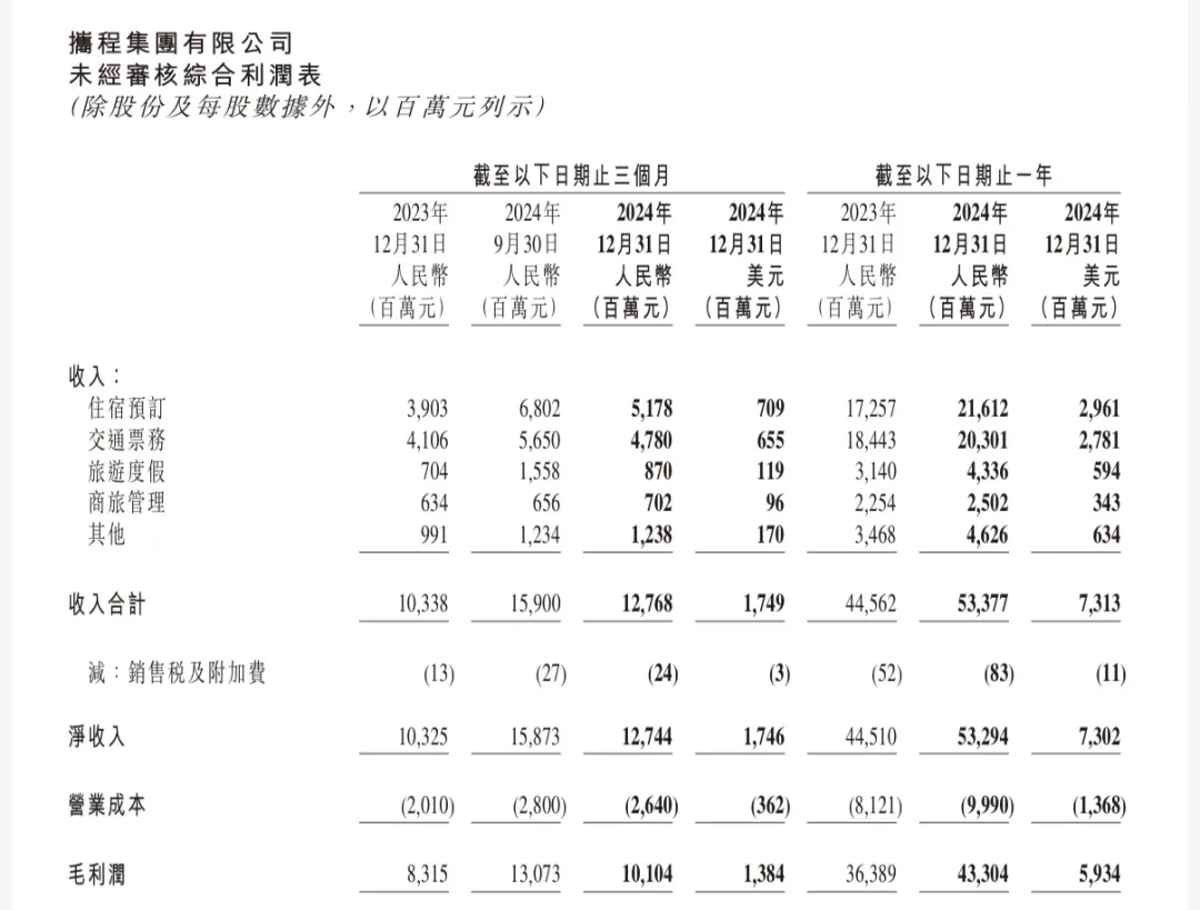 2024年,携程的营业收入同比增长19.73%,净利润同比增长72.08%,2022、2023、2024年的毛利率分别为77.48%、81.75%和81.25%;2025年Q1,营业收入同比增长16%,经调整EBITDA利润率达30.2%。