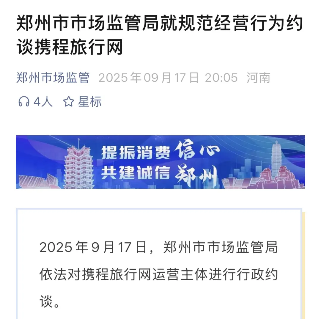 9月17日,郑州市场监管局约谈携程,因未经商家同意擅自修改酒店价格,并要求其严格按照时限完成整改。