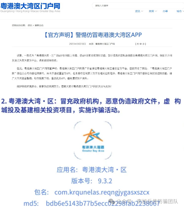 该涉诈APP是境外不法分子冒用“粤港澳大湾区门户网”的名义制作发布的。今年4月,粤港澳大湾区门户网与信息通信行业反诈中心均有发文表示,这个“粤港澳大湾区”APP就是诈骗软件。