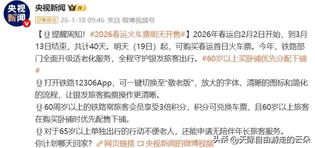 无论你是返乡团圆,还是踏上旅途,这份攻略助你从容应对。转发收藏,提醒身边人!更多实时资讯,关注@人民网、@央视新闻等官方账号,获取第一手春运动态。