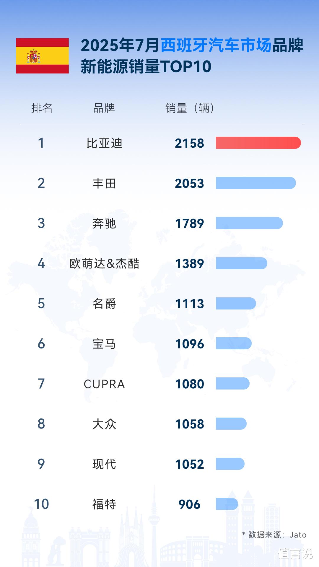 在西班牙,7月份就以2158辆销量荣登西班牙新能源品牌榜第一位置,比亚迪新能源汽车正在成为西班牙汽车市场的热门选择。