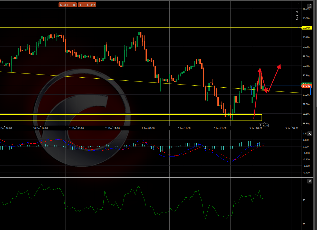 昨天给的原油的支撑(56.7)刚刚好,随着交易员在供应过剩担忧与地缘政治风险之间权衡,国际原油低位震荡。