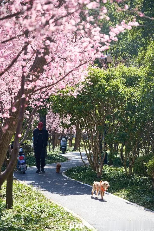从观鸟湿地出来,在政澄路旁的樱花道下,小狗在互相玩闹,往来的游客看见樱花忍不住拿出手机拍照。