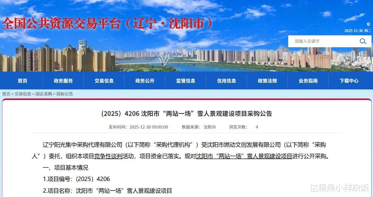 全国公共资源交易平台(辽宁·沈阳市)在2025年12月30日公示了沈阳市“两站一场”雪人景观建设项目采购公告。沈阳市燃烧动文创发展有限公司要在两个火车站和桃仙机场附近堆“雪人”了。具体要求如下:桃仙机场(开往春天的列车主题):于废弃电车铁轨处,创作《开往春天的列车主题》组雕。沈阳北站(“雪人”趣味主题):于广场打造雪人矩阵场景。为游客带来热情与快乐,展现城市独特生活方式。沈阳站(温情团圆主题):创作《雪人一家贺新年》主题雪雕。通过一家四口欢笑团聚的场景,结合冰糖葫芦等特色饮食元素及马年装饰,营造“在沈阳,过暖年”的浓厚氛围,传递家庭团圆与城市温情。这几个大“雪人”将在合同签订后10日内完成建设,在春季解冻后拆除,期间负责日常维护和两次外观洗雪。服务地点:桃仙机场、沈阳站、沈阳北站。而开标时间就是2026年1月5日上午9点。去年没能在“雪人”最美十克打卡的今年重新给你一次机会了。但是这几个小“雪人”的震撼是不如盛京大奥莱去年堆的巨大“雪人”的,不知道今年还会不会堆那个“雪人”promax。